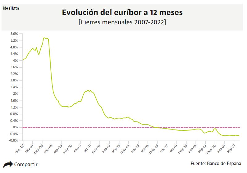 El euríbor vuelve a cambiar de tendencia. Tras despedir 2021 con descensos y muy cerca de mínimos históricos, el indicador de referencia para la mayoría de las hipotecas en España empieza el año al alza.