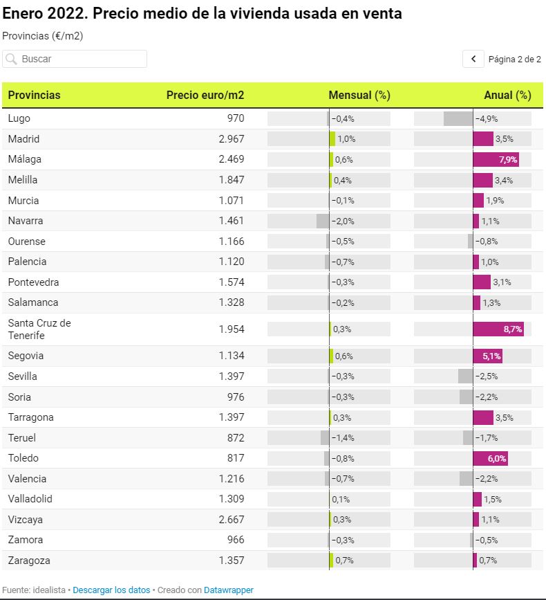 29 provincias tienen precios inferiores a los registrados hace un mes. La mayor caída se ha vivido en Navarra (-2%), seguida de Teruel y Castellón (-1,4% en ambas provincias), Albacete (-1,3%) y Toledo (-0,8%). En el lado contrario, Huesca y Madrid (1% en ambos casos) encabezan la lista de provincias en las que ha subido el precio durante el mes de enero, seguidas de Lleida y Zaragoza (0,7% en ambas provincias).