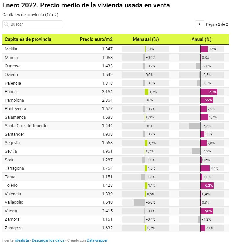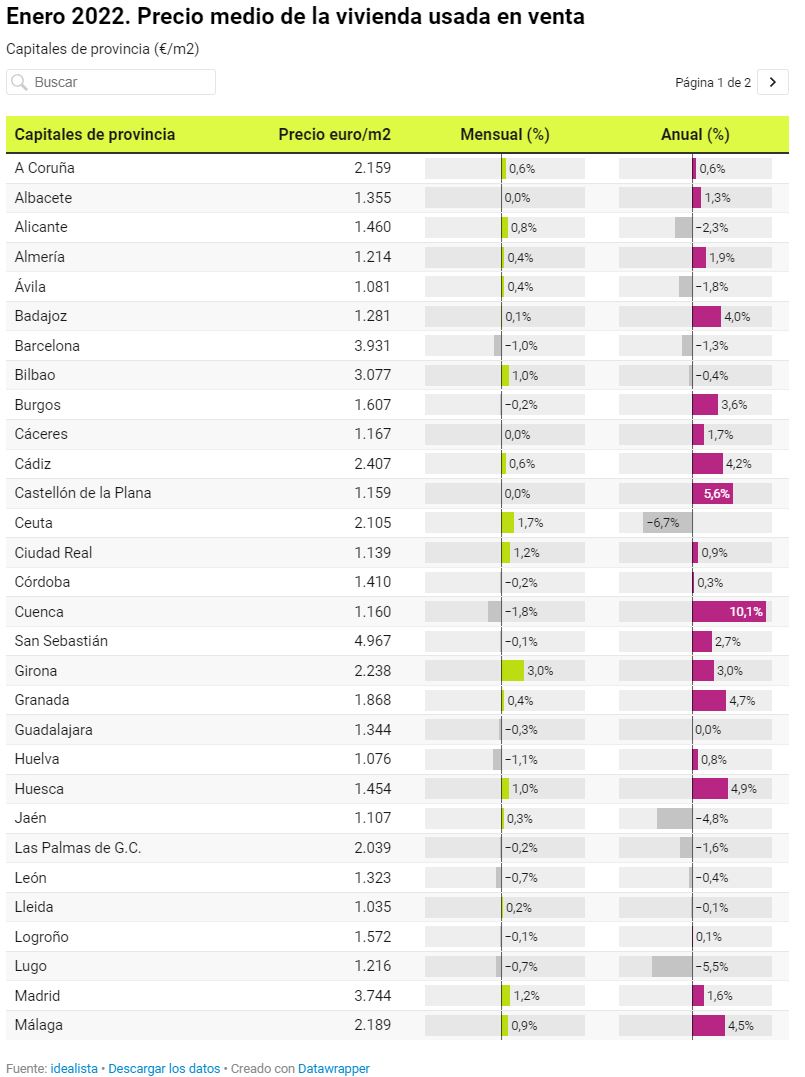 Durante el mes de enero, 19 capitales han experimentado decrementos en el precio de la vivienda. La bajada más pronunciada es la vivida por Cuenca y Teruel donde las expectativas de los vendedores cayeron un 1,8%, seguidas de Huelva (-1,1%) y Soria (-1%). Girona es, en cambio, el mercado donde más han subido los precios durante el mes de enero (3%), seguida de Ceuta y Palma (1,7% en ambos casos), Segovia, Madrid y Ciudad Real (1,2% en las tres capitales).